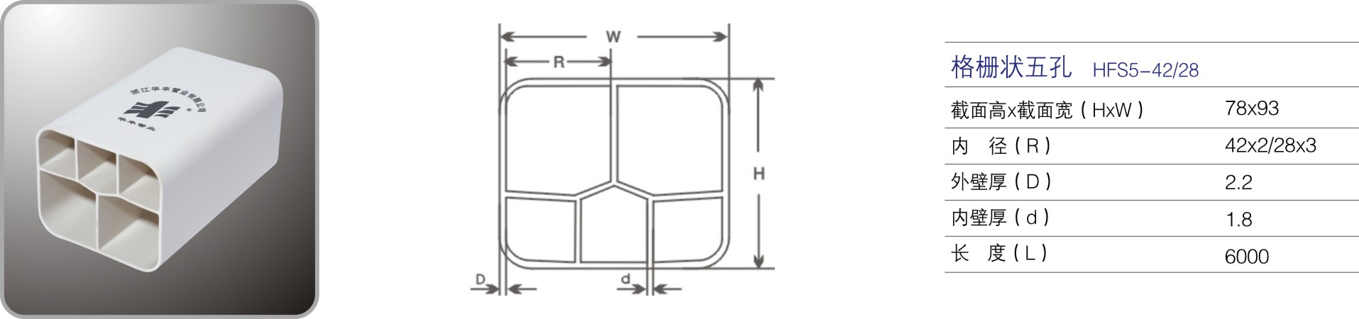 通信用PVC異徑五孔柵格管采用優質耐老化改良PVC工程塑料一次擠出,抗壓強度高,獨特的多孔一體力學支撐結構,顯著提高管材的抗壓能力,使管材比普通結構塑料管材抗壓性能高10~100倍,正常情況無須做基礎或包封,防沉降,能代替鋼管安全穿越馬路,阻燃(離火即熄性好),抗腐蝕,耐老化,埋地使用壽命長達50年以上。