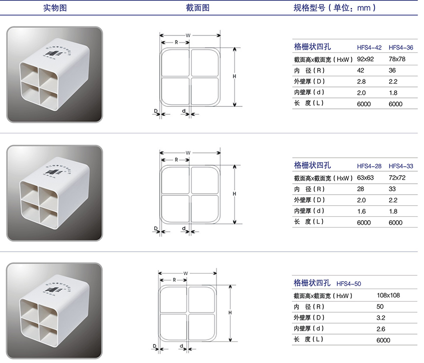 通信用PVC四孔柵格管采用優質耐老化改良PVC工程塑料一次擠出,抗壓強度高,獨特的多孔一體力學支撐結構,顯著提高管材的抗壓能力,使管材比普通結構塑料管材抗壓性能高10~100倍,正常情況無須做基礎或包封,防沉降,能代替鋼管安全穿越馬路,阻燃(離火即熄性好),抗腐蝕,耐老化,埋地使用壽命長達50年以上。